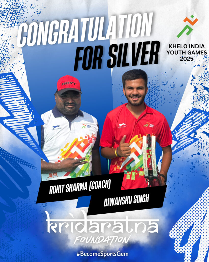 Kridaratna Foundation proudly congratulates Diwanshu Singh Chandrawanshi for winning Silver 🥈 medal in the Compound Individual category at the Khelo India Youth Games 2025 held in Bhagalpur, Bihar. As a talented archer of the Archery Training Center, Burmamines, Jamshedpur (A proud unit of Kridaratna Foundation) and a dedicated student of coach Rohit Kumar Sharma, Diwanshu’s achievement is a reflection of our collective efforts in nurturing sporting excellence. We wish him great success in the finals and a bright future ahead in archery.